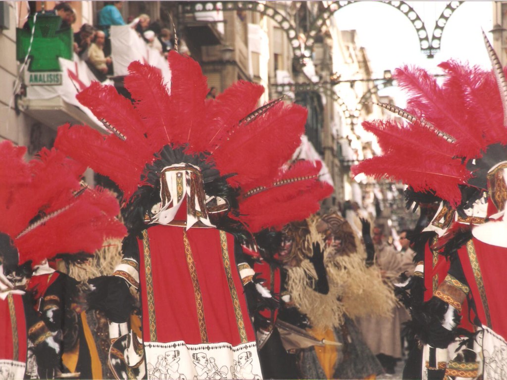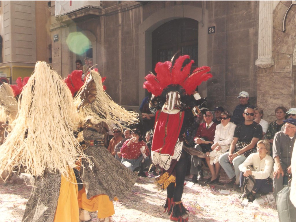 Dos tribus africanas se enfrentan en pleno continente africano. Unas bailarinas con un casco de plumas rojas y una capa tricolor contra las otras, vestidas con pieles y un gran casco que les protege del ataque hecho con materiales naturales.